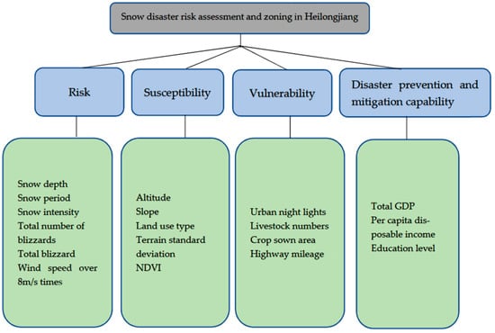 According to the theory of natural disaster risk formation, meteorological disaster risk is formed by four parts: risk, susceptibility (hazard-bearing object), vulnerability (hazard-bearing object), and the disaster prevention and mitigation capability. Each factor is composed of a series of subfactors. Its expression is: