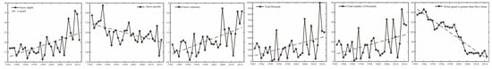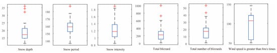 In this paper, the snow depth, the length of the snow-cover period, the snowfall intensity, the total blizzard volume, the total number of blizzards, and the total days of wind speeds over 8 m/s were selected as the risk factors of snow disaster. The deeper the snow depth, the longer the snow-cover period, the stronger the snowfall intensity, the greater the blizzards, the greater the total number of blizzards, and the more days with wind speeds over 8 m/s, the greater the risk of snow disasters. Figure 3 shows the interannual variation characteristics of the snow depth, the snow-period length, the snow intensity, the total blizzard volume, the total number of blizzards, and the days with wind speeds over 8 m/s in Heilongjiang Province, from 1983 to 2020. It can be seen that the snow depth, snow intensity, total blizzard volume, and the total number of blizzards in Heilongjiang Province show a significant increase, and the M–K statistics are 2.869, 3.269, 1.968, 2.014, respectively. The length of the snow-cover period and the wind speeds showed a significant decrease, and the M–K statistical values were −3.223 and −6.43 (Table 3). It can be seen from the distribution of the box map (Figure 4) that the snow depth, the snow-period length, the snow intensity, the total blizzard volume, the total number of blizzards, and the days with average wind speeds over 8 m/s are 20.82 cm, 165.4 d, 1.24 cm/time, 142.0 mm, 9.9 times, and 92 d, respectively. The interannual changes in the wind speed, snow intensity, the number of blizzards, and the snow depth are relatively large, while the interannual changes in the snow depth and the blizzard volume are relatively small. It can be seen from the extreme value distribution characteristics that the maximum value of the snow intensity, the maximum value of the blizzard volume, and the number of blizzards are obviously larger than the average values, while the minimum value of the days with wind speeds over 8 m/s is obviously smaller than the average value. Using the Pettitt method to calculate the mutation year of each hazard factor, it was concluded that the snow depth, the snow-cover length, the snow intensity, and the days with wind speeds over 8 m/s days in Heilongjiang Province all have abrupt changes around the early 2000 s, and the catastrophes of the total snow cover and the total number of snowstorms occur in the middle and late parts of the 2000 s, respectively.
