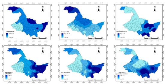 Figure 5 shows the spatial distribution of the snow depth, the snow-period length, the snow intensity, the total blizzard volume, the total number of blizzards, and the days with wind speeds over 8 m/s in Heilongjiang Province, from 1983 to 2020. It can be seen that the snow depths of Heilongjiang Province, from 1983 to 2015, are between 7.39 and 35.26 cm, and that the snow depths of 25–35.26 cm are mainly distributed in Mohe County in the northwest, northwest of Tahe County, northwest of Huzhong District, Xunke County, Jiayin County, north of Yichun City, north of Hegang City, and north of Luobei County; snow depths of 15–25 cm are mainly distributed in most cities and counties in central and southern Heilongjiang Province; snow depths of 7–15 cm are mainly distributed in the southwest of Heilongjiang Province, including Qiqihar cities and counties, Daqing, and the southwest of Suihua. The length of the snow period in Heilongjiang Province from 1983 to 2015 is 150–200.3 days. Snow periods of more than 180 days are mainly distributed in the Daxing’anling area, in the north of Heilongjiang Province; the areas of snow periods of more than 160 days are mainly distributed in central and northern Heilongjiang Province; the areas with a snow-cover period of less than 160 days are mainly distributed in the southern part of Heilongjiang Province. The length of the snow-cover period of the province generally increases from low latitudes to high latitudes. The snow intensity in Heilongjiang Province from 1983 to 2020 was from 1.23–2.10 cm/time. The areas with higher snow intensities are mainly located in the east of Hegang, Jiamusi, and in Shuangyashan in the east; the areas with moderate snow are mainly located in the east of Heilongjiang Province and Mohe County; and the areas with low snow intensity are mainly distributed in the west of Heilongjiang Province. The total blizzards in Heilongjiang Province from 1983 to 2020 were between 0 and 761.9 mm, and the blizzards above 200 mm were mainly distributed in Jiamusi, Hegang, Shuangyashan, Qitaihe, Jixi, and Mudanjiang, in eastern Heilongjiang Province; the areas with blizzards above 100 mm were mainly distributed in the Yichun, eastern Suihua, eastern Harbin, Mudanjiang, and Daxing’anling regions, in the central part of Heilongjiang Province; the areas with blizzards below 100 mm were mainly distributed in Heihe, Qiqihar, Daqing, Suihua, and Harbin, in the western part of Heilongjiang Province. The total number of blizzards in Heilongjiang Province from 1983 to 2020 was between 5 and 20 times. The total number of blizzards above 15 were mainly located in Jiamusi, Hegang, Shuangyashan, Qitaihe, Jixi, and Mudanjiang, in eastern Heilongjiang Province; the number of blizzards were 10 in the areas mainly distributed in Qiqihar, Daqing, Suihua, and Harbin, in the west of Heilongjiang Province. In Heilongjiang Province, from 1983 to 2020, the number of days with wind speeds over 8 m/s were 70–187.7 days, and the days with wind speeds over 8 m/s over 110 days were mainly distributed in Jiamusi, Hegang, Shuangyashan, Qitaihe, Jixi, and Mudanjiang, in eastern Heilongjiang Province. The areas with wind speeds> 8 m/s within 90–130 days are mainly distributed in the Qiqihar, Daqing, Heihe, and Daxing’anling areas, in western Heilongjiang Province; the areas with wind speeds over 8 m/s below 90 days are mainly distributed in Heihe, Suihua, and Iraq, in central Heilongjiang Province.