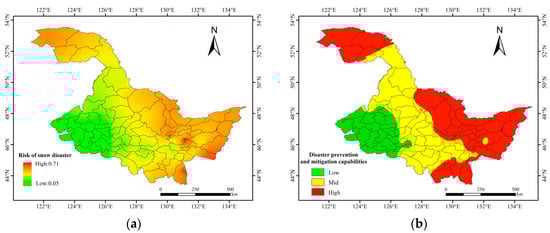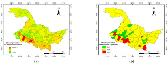The weight in Table 2 is used to perform the spatial superposition of the prevention and mitigation capacity factors to obtain the prevention and mitigation capacity zoning results of snow disaster in Heilongjiang Province (Figure 12a). The spatial distribution of the snow-disaster prevention and mitigation capacities in Heilongjiang Province is uneven and is high in the southern regions, and low in the northwestern regions. The prevention and mitigation capacity index is equally divided into three levels, and the spatial distribution of the prevention and mitigation capacity classification is presented in Figure 12b. High disaster prevention and mitigation capabilities accounted for 7.4% of the entire Heilongjiang area, and were distributed mainly in Qiqihar City, Daqing City, Zhaodong City, Hulan District, Harbin City, Acheng District, Shuangcheng City, Mudanjiang City, Jiamusi City, Suifenhe City, and Dongning County; middle disaster prevention and mitigation capabilities constituted 84.0% of the entire Heilongjiang area, and were distributed in most cities and counties in Heilongjiang Province; and low disaster prevention and mitigation capabilities covered 8.6% of the entire Heilongjiang Province area, and were distributed mainly in Sunwu County, Gannan County, Tailai County, Lindian County, Kedong County, Baiquan County, Mingshui County, Qinggang County, Wangkui County, Lanxi County, Suileng County, and Jixi City. The figure shows that the more developed the economy, the stronger the disaster prevention and mitigation capability.