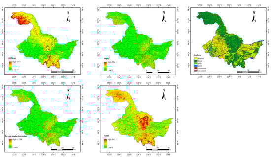 Heilongjiang Province altitude, slope, land-use type, terrain standard deviation, NDVI spatial distribution maps.