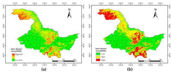 The weight in Table 2 is used to perform the spatial superposition of the susceptibility factors to obtain the susceptibility zoning results of snow disasters in Heilongjiang Province (Figure 8a). The spatial distribution of the snow-disaster susceptibilities in Heilongjiang Province is high in the central and northwestern regions, and is low in the eastern and western regions. The susceptibility index is equally divided into three levels (as shown in Table 4), and the spatial distribution of the susceptibility classification is presented in Figure 8b. High susceptibilities accounted for 16.3% of the entire Heilongjiang area, and were distributed mainly in the northern region (southern Mohe County, Huzhong District, Xinlin District, Yichun City, Tieli City, and Mudanjiang City); medium susceptibilities covered 35.6% of the entire Heilongjiang area, and were distributed largely in the central region of Heilongjiang Province (Heihe City, Huma County, Tahe County, Jixi City, and Yichun); and low susceptibilities accounted for 48.1% of the total area of Heilongjiang Province, and were distributed mainly in the western (Qiqihar, Daqing, Suihua, and Harbin) and eastern (Jiamusi, Shuangyashan, and Jixi) regions of Heilongjiang Province. Heilongjiang Province is located in the Northeast Plain and includes the Songnen Plain and the Sanjiang Plain. Other regions with high susceptibilities were distributed in the Daxinganling, Xiaoxinganling, and Mudanjiang mountainous regions.