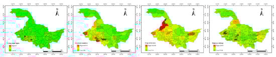 Figure 9 shows the spatial distributions of urban lights, livestock numbers, crop-sown areas, and highway mileages in Heilongjiang. It can be seen that the urban night lights are between 0 and 63, and that the high values of urban night lights are scattered in prefecture-level cities and urban areas, while urban night lights in country-level cities are relatively low. The livestock numbers are from 498 to 665,511, and the areas with high levels are mainly distributed in Longjiang County, Shuangcheng City, and Zhaodong City, in the southwest of Heilongjiang Province. The crop-sown areas are from 214 to 342,188 km2, and the areas with high levels are mainly distributed in Songnen Plain and Sanjiang Plain. The highway mileage is between 92.88 and 25,455, and the areas with high levels are distributed in Qiqihar city, Harbin city, Suihua city, and Heihe city, in Heilongjiang Province.