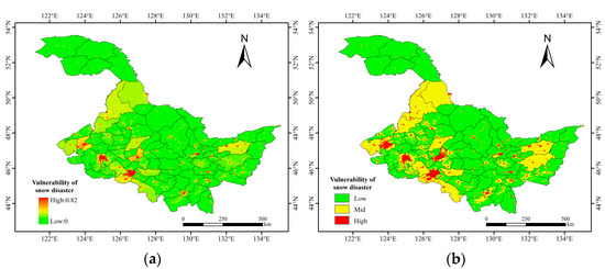 The weight in Table 2 is used to perform the spatial superposition of the vulnerability factors to obtain the vulnerability zoning results of snow disasters in Heilongjiang Province (Figure 10a). The spatial distribution of the snow-disaster vulnerabilities in Heilongjiang Province is high in the western regions, and low in the central and northwestern regions. The vulnerability index is equally divided into three levels, and the spatial distribution of the vulnerability classification is presented in Figure 10b. High vulnerabilities accounted for 3.0% of the entire Heilongjiang area, and were distributed mainly in the economically developed main urban areas (Qiqihar City, Daqing City, Harbin City, and Suihua City), as well as other small parts of cities and counties; medium vulnerabilities constituted about 27.9% of the entire Heilongjiang area, and were distributed chiefly in Heihe City, Nenjiang County, Nehe City, Longjiang County, Zhaodong City, Wuchang City, Fujin City, Baoqing County, and other cities and counties of Heilongjiang Province; and low vulnerabilities accounted for 69.1% of the entire area of Heilongjiang Province, and were distributed mostly in the northern and central regions of Heilongjiang Province. As shown in the figure, high vulnerabilities were distributed mainly in regions with more urban lights and larger populations, which have been significantly affected by disasters.