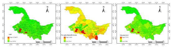 Figure 11 shows the spatial distributions of the total GDPs, per capita disposable incomes, and education levels in Heilongjiang. It can be seen that the total GDP is between 25,538 and 15,324,071, and that the high values of the total GDPs are mainly distributed in Daqing City, Qiqihar City, and Harbin City. The per capita disposable income is between 2514 and 14,850, and the areas with high levels are mainly distributed in Daqing City, Harbin City, Dongning County, and Hailin City. The education level is between 2300 and 73,770, and the areas with high levels are the same as those with high total GDPs.