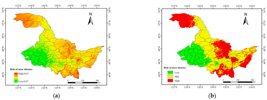 The spatial superpositions of the risk factors are used to obtain the disaster risk zoning results of snow disasters in Heilongjiang Province (Figure 6a). The spatial distribution of hazards is uneven, and there are high-value areas locally. The risk index is equally divided into three levels (as shown in Table 4), and the spatial distribution of the risk classification is presented in Figure 6b. The spatial distribution of the snow-disaster risk in Heilongjiang Province followed a decreasing trend from east to west. High-risk areas accounted for 46.3% of the entire Heilongjiang area, and were distributed mainly in the eastern region of Heilongjiang (Jiamusi, Yichun, Jixi, Qitaihe, Hegang, Shuangyashan, Xunke, and Mudanjiang) and the northwestern Daxing’anling area; the medium-risk areas covered 36.8% of the entire Heilongjiang area, and were distributed primarily in the central region of Heilongjiang Province (eastern Daxing’anling, Heihe, eastern Suihua, northern Mudanjiang, and eastern Harbin); and the low-risk areas accounted for 16.9% of the total area of Heilongjiang Province, and were distributed mostly in the western region of Heilongjiang Province (Qiqihar, Daqing, western Suihua, and western Harbin).