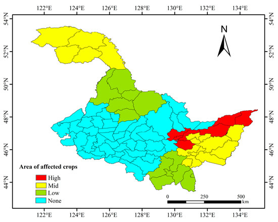 (2) In the process of zoning, not only can we obtain a spatial distribution map of the different factors that affect not only the risk, susceptibility, vulnerability, and disaster prevention and mitigation capability, but also a zoning map of the risk, susceptibility, vulnerability, disaster prevention and mitigation capability, and the comprehensive disaster risk. Therefore, this method is conducive to the comprehensive analysis of disaster risk. For example, the Sanjiang Plain, in the east of Heilongjiang Province, is a high-risk area for snow disasters, compared with Figure 14, and most of the final comprehensive snow-disaster risk is in a medium-risk area. The main reason is the low susceptibility and the low vulnerability. The comparison and influencing factors can be further analyzed as follows: Although the snow depth, intensity, blizzard volume, and the number of blizzards are relatively large and strong here, it is a plain with a low altitude, small slopes, and small topographical fluctuations. This area is, especially, a primarily agricultural area, basically consisting of arable land, and there are almost no crops in winter, so the comprehensive risk of snow disaster is low. Therefore, the results of the snow-disaster risk zoning in this paper provide theoretical support for the government and for disaster prevention and relief departments to formulate predisaster mitigation plans, and to help with postdisaster relief decision-making.