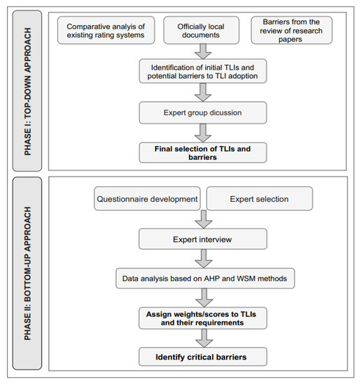 This approach aims to assign weightings/scores to TLIs and identify critical barriers to their implementation. Among Multi-Criteria Decision Making (MCDM) tools for obtaining the weighting system and selecting the best alternatives, the AHP and Weighted Sum Model (WSM) methods are the leading methods and most widely used in green buildings and sustainable transportation infrastructure projects [30,31].