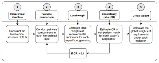 This study employed a five-step AHP calculation to assign weights to TLIs for a green urban road rating system in Taiwan, as shown in Figure 2.