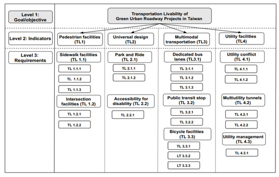 One of the significant barriers preventing bicycle trips in Taiwan urban areas is the lack of connectivity between bicycle paths and public transport networks [22]. In addition, the lack of laws governing the use of bicycles and the supporting infrastructures has caused traffic accidents related to cyclists [23]. Notably, the existing road infrastructure conditions in many areas in Taiwan are not suitable for bicycles when a small portion of roads nationwide allocate separated lanes for cycling [24]. These mentioned facts raise the necessity of incorporating transportation livability standards into urban road projects in Taiwan. Hence, proposing TLIs in a TGUR rating system facilitates promoting related best practices and evaluating the transportation livability performance of urban streets in Taiwan. Such a sustainability rating system can be perceived as a form of decision support tool for transportation public agencies in Taiwan.