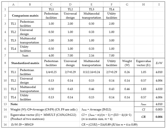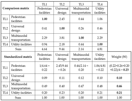 After getting the single matrix of different experts’ judgments, the weight of indicators/requirements can be calculated. Figure 4 presents a single matrix using GM from 12 experts to calculate a standardized matrix and the weights of four TLIs. Following this process for other comparison matrices, the local weights of all requirements in the TLI hierarchy were determined. Prior to the synthesizing procedure, the pairwise comparison matrices of each expert must meet the accepted consistency ratios that were demonstrated in the next step.