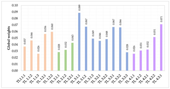 The global priority weight of an attribute (i.e., indicator, sub-indicator, and requirement) at the lower level was calculated by multiplying its local weight with the local weight of the related attribute in previous levels in the hierarchical structure. It should be noted that local weights were identified directly by using the AHP. For indicators, their global weights are equal to those local weights as they are top-level in the hierarchical level. The below example shows the calculation of the global weights for requirements under indicator TL1 as follows: