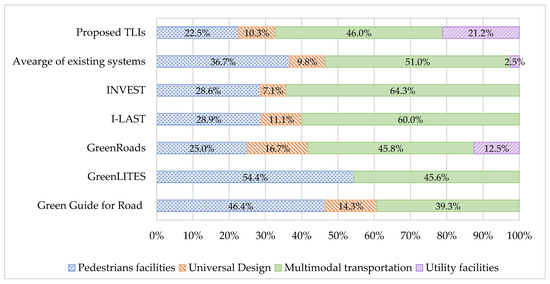 There is heterogeneity in indicator weights among rating systems that reflect the diverse concerns of developers based on the distinct conditions. This means that the indicator weights may vary from system to system, originating from different countries/regions. Hence, a comparative analysis was conducted to investigate differences and similarities in the allocated points to TLIs among existing systems and proposed TLIs in this research, as demonstrated in Figure 7.