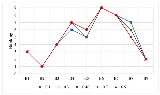 This research conducted the changing indicator weight for WSM in the sensitivity analysis. When an indicator weight is changed, other weights of indicators are decreased and increased by the proportional change of the indicator weight. Table 5 reveals that the TL3 indicator has the highest weight and thereby influences the other indicators. Accordingly, this indicator was selected with its weight varying from 0.1 to 0.9 with a 0.2 increment. Because the original weight of TL3 (i.e., 0.46) is close to 0.5, this value was not considered in the sensitivity analysis. The change in other indicator weights was calculated by the proportional adjustments in Equation (14).