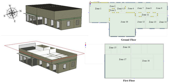 For the purpose of the sensitivity analysis, family building is proposed, representing a typical residential building type in the world’s largest building sector. This reference building is a two-story floor located building in Budapest, Hungary (Figure 1). The ground floor area consists of 14 zones with a total area of 200 m2 with a ceiling height of 2.8 m, 4 zones are distributed on the first floor the first-floor area is 187 m2 with a ceiling height of 2.6 m.