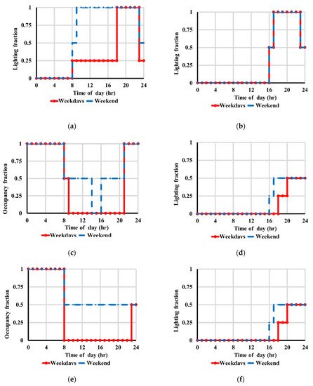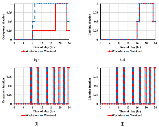 Occupancy and lighting schedules on weekdays and weekend for different thermal zones (a,b) living room; (c,d) bedroom; (e,f) children room; (g,h) kitchen; and (i,j) toilet.