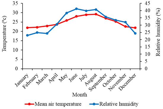 Hungary is located in the temperate climatic zone. The average monthly temperate and relative humidity are shown in Figure 3. The highest temperature was observed in August with an average value of 29.2 while December represents the coldest month with an average temperature of 21.9 °C. In this building, the average relative humidity is 32.4%. The heating–cooling temperature was defined between 21 and 25 °C, heating–cooling temperature, and heating–cooling temperature between 20 and 80%.
