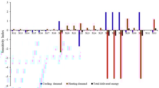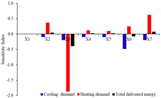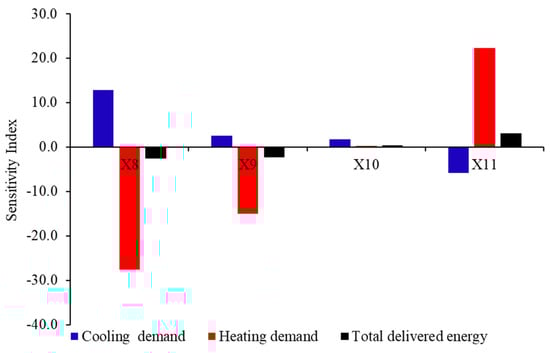 Figure 6 presents the mean sensitivity coefficient of material change design parameters. With respect to material change design parameters, the weights of exterior floor material (X8) are 27.7% and 12.8% for heating and cooling demand, respectively. The exterior floor material of the roof also plays an important role in delivered energy. The sensitivity coefficient of the glazing type (X11) is 22.3% and 5.9%, and the sensitivity coefficient of the exterior wall material (X9) is 15.1% and 2.6% for heating and cooling demand, respectively. On the other hand, the internal wall materials (X10) have minimal effect on the energy demand for cooling and heating with a sensitivity coefficient of 0.2% and 1.7%, respectively.