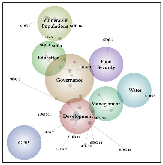 The eight core themes that emerged from the automatically generated heatmaps (Figure 1) included (from most to least significant): Development, Governance, Vulnerable Populations, Education, Management, Water, GDP, and Food Security. The location of the SDG relative to the theme bubble indicates the closeness of that relationship. For example, SDG 11—Sustainable Cities and Communities—was closer to the Governance theme (contained within the theme bubble), than SDG 15—Life on Land—was to the theme entitled Development. Notably, the GDP theme bubble is separate from all other themes.
