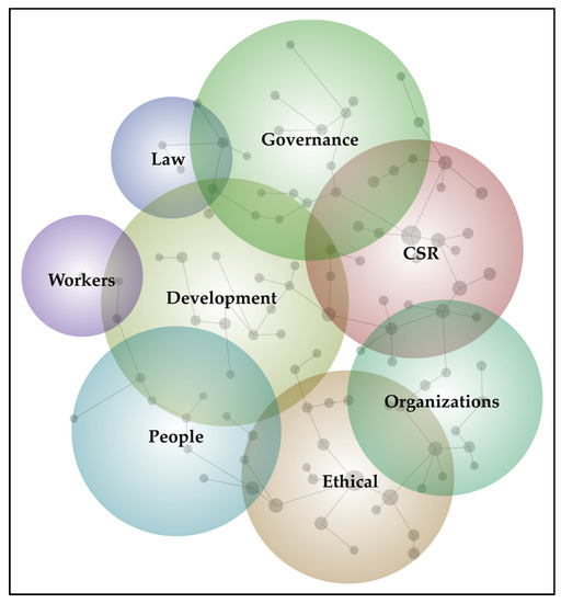 From the heat mapping, the eight themes that emerged from the Journal of Business Ethics were (from most to least significant): CSR (Corporate Social Responsibility), Ethical, Development, Governance Organizations, People, Law, Workers (see Figure 3). In contrast, Figure 4 shows the eight themes, the significance and the connections between themes that emerged from the articles contained within the Accounting, Organizations, and Society journal (from most to least significant): Management, Accounting, Firm, Governance, Auditors, People, Control, Users.