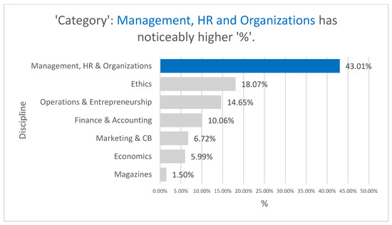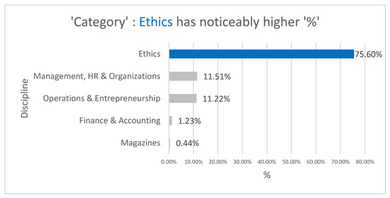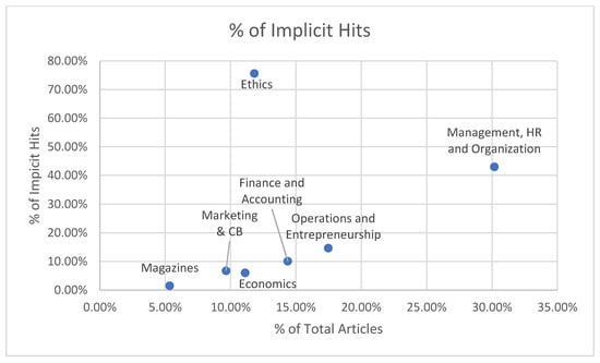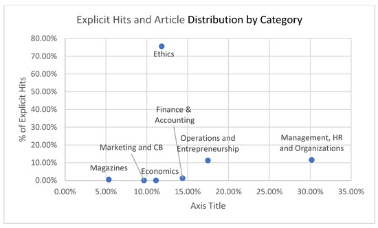 Total implicit hits (706,442) broke down as follows: 43.0% from Management, HR and Organizations, 18.1% from the category Ethics, 14.7% from Operations and Entrepreneurship, 10.1% from Finance and Accounting, 6.7% Marketing and Consumer Behavior, 6.0% from Economics, and 1.5% from Magazines (see Figure 7). Figure 8 compares the explicit SDG theme hits and article distribution by category.