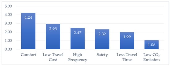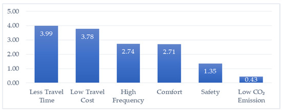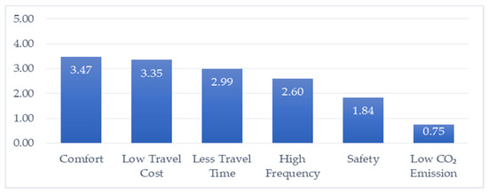 Respondents traveling by car ranked comfort as the most important factor, followed by low travel cost, high frequency, safety and less travel time. Low carbon emission was considered the least important (Figure 1).