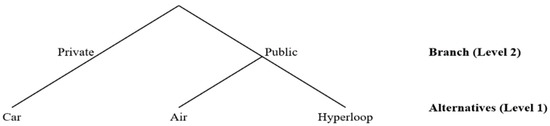 Mode choice is affected by various attributes. Questionnaires are designed to explore the respondent’s data, which usually includes socioeconomic characteristics, trip characteristics, mode choice preference, attitudinal information and diagnostic questions, in order to assess the understanding of the questionnaire by the individual [18,19,20,21]. Intercity travel, travel time, travel cost and service frequency are considered to have the most profound influence on mode choice [15]. Occupation, household income, education and purpose of the trip are also key factors in determining the competition between alternatives for intercity travel [22]. Attributes such as nationality, privacy, convenience, comfort, safety and weather conditions can also be considered, along with socio-economic, trip and travel mode characteristics to estimate potential modal split [23]. However, it is not advisable to include attributes such as privacy, comfort, convenience and reliability at the planning stage, due to insignificant improvements in mode choice models and difficulty in obtaining such perceptions [24].