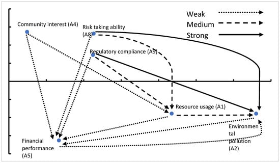 Firms are embedded in complex relationships with internal and external stakeholders. These stakeholders are crucial to the firm’s performance because they have the ability to influence the firm’s long-term strategic goals; hence, incorporating stakeholder demands directly and clearly is vital [56]. One of the most influential stakeholders is government, which demands regulatory compliance (A9). Many firms have adopted an informed and strategic stance to regulations to ensure that environmental measures are likely to result in competitive advantages [57]. Moreover, Danso et al. [57] claimed that benefits may accrue as a result of reactive actions such as regulatory government policies or as a result of high proactive efforts. Chatzitheodorou et al. [16] and Zhao et al. [58] argued that government exerts significant influence on firms regarding sustainability issues. Government formulates both legislative (C38) and national (C39) standards [59]. Wagner [52] argued that strict environmental legislation will cause extra expense for firms that do not comply. Indeed, national and regional legislation have increased their authority and ability to interrupt firm operation through sanctions and penalties if firms do not comply with the legislation. Under the close control of the government (C41), implementing company sustainability practices should be regarded as a collaborative initiative to lessen regulatory pressure [59].