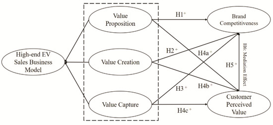 Value creation is a series of economic activities of companies to produce and supply products and services for potential customers to satisfy their needs; it is the central cog of the business model [68]. The primary objective of a successful business model is to create a valued, trustworthy and unique product or service [69]. A successful value creation process makes brands differentiate themselves against fierce competition [70]. Many scholars have studied the relationship between value creation and brand competitiveness in different areas. Jamie Carlson has studied on how customer participation affects value creation activities and how these changes will influence brand competitiveness in social media brand communities in the retailing sector, they found that customer participation can improve value creation and thus enhance brand competitiveness [71]. Óscar González-Mansilla has studied the impact of value creation on hotel brand equity and found that customer participation could positively affects the value creation and value creation positively affect brand equity [72]. The high-end EV sales business model first aims to shape the brand, occupy the top of the electric vehicle market and has a high degree of market recognition by creating and producing electric cars full of technology, sustainable energy and luxury [73]. Automakers first concentrate on creating valuable electric cars with high-quality, well-thought-through set of hardware which could be improved with over-the-air software updates almost endlessly for free. This gives the brand opportunity to overtake traditional auto brands. After acquiring high-end brand image, it aims to create value from offering affordable vehicles and services to gain market share. Therefore, we argue that the value creation process of high-end EV sales business model has a direct and significant impact on brand competitiveness.