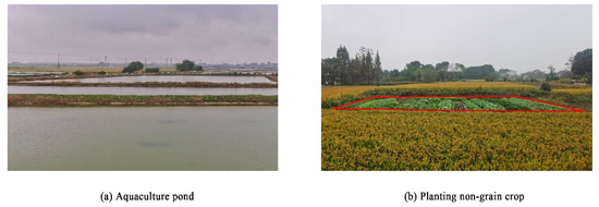 The grain types in Liyang mainly include wheat, broad bean, rice, corn, beans, and potato. Among them, wheat and rice are the most important grain crops in Liyang, and their sowing area accounts for 92.56% of the total sowing area. As shown in Figure 2, the non-grain production type of Liyang mainly includes aquaculture and planting non-grain crop. Aquaculture is mainly used for raising shrimp and crabs. Planting non-grain crop focuses on planting species with high economic value, such as nandina, lawn and high-quality vegetables.