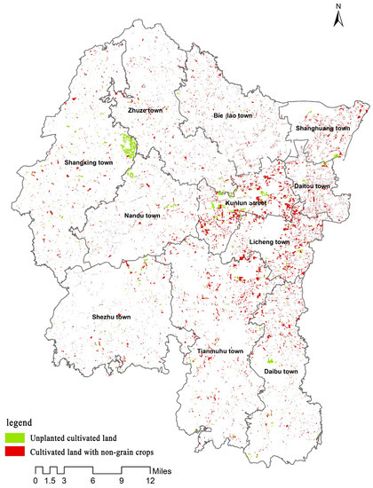 Unplanted cultivated land is mostly found in Shangxing Town and Kunlun Street. As shown in Figure 3, for unplanted cultivated land, paddy fields and dry land cover an area of 662.12 and 322.76 hectares, accounting for 66.55% and 33.45% of the total, respectively. Cultivated land with non-grain crops is concentrated in Kunlun Street and its neighbors, Daitou Town and Licheng Town. As the land quality of paddy fields and irrigable land is superior, they can be used to grow various crops. Over 95.24% of the paddy fields and irrigable land are used to plant non-grain crops.