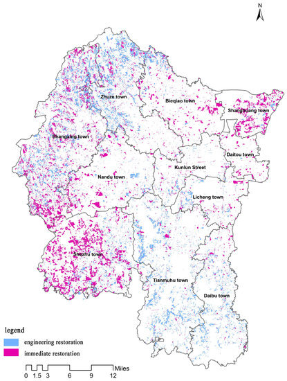 As shown in Figure 4, the cultivated land that can be restored with the engineering approach is concentrated in Shezhu Town and Shanghuang Town, the economy of which is underpinned by aquaculture. The villagers turn the cultivated land into ponds, the depth of which varies depending on the species farmed. If the pond is too deep, the farming layer of the cultivated land will be destroyed. Engineering restoration is required before the land is used to grow crops again. Cultivated land in need of immediate restoration is mostly found in Shangxing Town and Zhuxi Town, most of which is forest and garden land. Tree planting on this land will increase the fertility of the cultivated land and conserve water and soil, which makes restoration much easier.