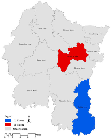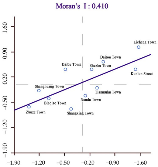The global spatial autocorrelation presents the spatial correlation of the cultivated land for non-grain production across all towns and districts of Liyang. As shown in Figure 5, the global Moran’s I value of the non-grain cultivated land in Liyang is 0.41, calculated with GeoDa. This means that towns and districts with a higher proportion of non-grain cultivated land have a positive effect on the non-grain production of cultivated land in neighboring towns and districts. In the Moran scatter plot, the first and third quadrants demonstrate positive spatial autocorrelation, i.e., the space is homogenous; while the second and fourth quadrants show negative spatial autocorrelation, i.e., the space is heterogeneous [43].