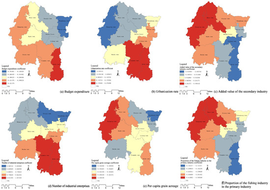 Spatial distribution of GWR regression coefficient: (a) budget expenditure; (b) urbanization rate; (c) added value of the secondary industry; (d) number of industrial enterprises; (e) per capita grain acreage; and (f) proportion of the fishing industry in the primary industry.