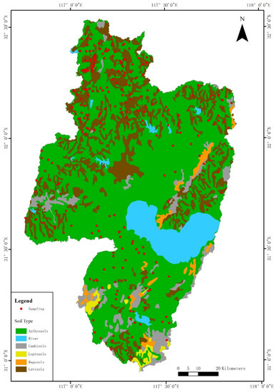 The soil types used in this study are listed in Table 3. Of the 295 total sampling points, 204 samples were taken from anthrosols (54.86% of the area) and 84 samples were taken from the luvisols (13.90% of the area). The other soil types covered smaller areas and consequently fewer sample points, without suitable conditions for modeling.