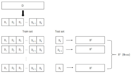 The sampling points were divided into 265 points (90%) for the training set and 30 points (10%) for the test set for modeling and testing. R2, RMSE, and MAE were used to evaluate the accuracy and stability of the model. K-fold cross-validation was used to validate the training set of the model, and the hyperparameters were adjusted using a grid search [68,69]. The K-fold cross-validation [70,71] divided the training set into K equal parts, leaving one part as the test set and the rest as the training set. The cross-validation was repeated K times, each sub-sample was verified once, and the average of the K results was taken as the model result. In this study, K = 10 means that we performed 10-fold cross-validation (Figure 3).