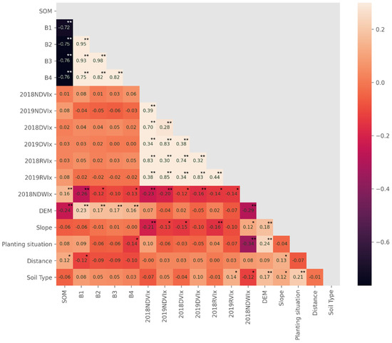 As the features to establish a correlation heat map with SOM content, we used the GF-6 satellite’s four-band reflectance data (B1–B4), six synthetic maximum vegetation indices in 2018 and 2019 (2018NDVIx-2019RVIx), 2018 synthetic maximum normalized water index data (2018NDWIx), DEM and slope data, land use data (cultivated land planting situation and soil type), and the spatial distance data between sampling points and residential areas (Figure 6). We concluded that the SOM content of the sampling point is highly correlated with the reflectance data of the four GF-6 bands.