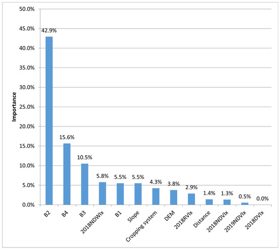 Feature importance is an important reference when selecting features. The XGBoost model uses the gain criterion to calculate the importance of each feature when participating in model training. The gain is calculated by the contribution of the feature to each tree, that is, the contribution of each feature to the generative model. The higher the value, the greater the importance of this feature to the prediction of the model [75]. The importance of each feature in the anthrosols dataset on the XGBoost model was ranked to explore the influence of different features in the same dataset on the prediction accuracy of the model (Figure 7).