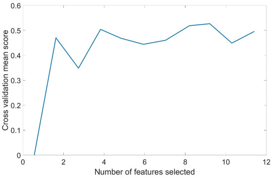 A 10-fold cross-validation mean was used to evaluate the influence of different numbers of features on the predictive ability of the model. From the experiment, we found that when the number of features involved in the fitting is nine, the maximum cross-validation mean is 0.565. Therefore, we took the top nine features with the most important features to participate in the training, and the model has the best fit (Figure 8).