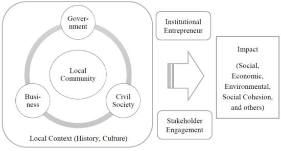 This study adopts the following framework to analyze the process of social innovation. The framework has four key components: (1) the role of three sectors (government, business, and civil society including philanthropy) and inter-sectoral cooperation, framed in the local historic, cultural, relational, and power contexts; (2) the significance of ‘institutional entrepreneur’ such as (but not restricted to) ‘entrepreneurial philanthropy’ to scale the social innovation initiative and to involve local stakeholders, and (3) engagement of local stakeholders to the initiative; and (4) the impact and change caused to the local community (Figure 1) [8,25].