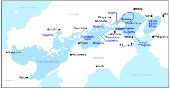 Setouchi Inland Sea and Art Setouchi site (from japan-guide.com, accessed on 11 July 2021): Three islands in oval (Naoshima, Teshima, and Inujima) are BASN sites.