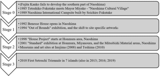 There is already a considerable body of literature on BASN and Art Setouchi/Setouchi Triennale, including documentation written by key persons involved in the processes, which mostly focuses on the contribution of local governments (Naoshima town and Kagawa prefecture) and private business (Benesse Holdings) to develop the initiatives [26,27,28,29,30,31,32,33,34].
