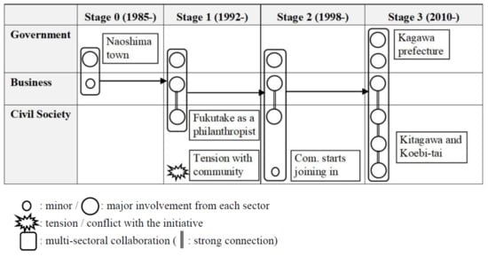 This study is based on the review of existing literature and archival analysis together with supplementary fieldwork and in-depth semi-structured interviews with key stakeholders. Interviews took place from July 2020 to July 2021 to hear mainly about their personal experience in BASN/Art Setouchi activities. Interviewees included Mr. Soichiro Fukutake and Mr. Fram Kitagawa, and others—three from public (Naoshima town office and local council), six from private (Benesse Holdings and relevant corporates, and local businesses), and four from civil society sectors (Fukutake Foundation and other nonprofits and local residents). Based on the collected information, we apply a tri-sectoral analysis framework [20,35] to reconstruct the development of BASN/Art Setouchi as social innovation processes, then to review the contribution from three different sectors (government, private, and civil society). We also examine whether BASN/Art Setouchi as social innovation had an economic effect and improved the well-being of the community, and provided social cohesion alongside the value and perception of the society. The study received approval (number: Soc_2021_03) from the Research Ethics Committee, Graduate School of Humanity and Social Sciences, Okayama University.