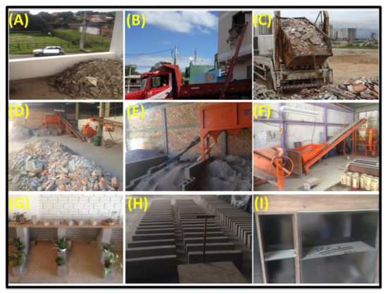 Summary of the main activities involved in the recycling of waste construction materials. (A) Manual deposition without personal protective equipment; (B,C) Accumulation of waste in trucks and buckets; (D) Warehouse yards/disposal and accumulation of rejects in the recycling company’s yards for further treatment; (E) Grinding of rejects; (F) Separation of the materials contained in the rejects via jigs; (G,H) Examples of concrete blocks built with recycled material; (I) Illustration of an office bookcase that, although not part of the recycling process, was included in the study due to the large accumulation of sedimented particulate.