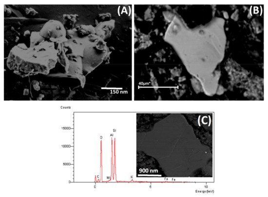 Principal particles and minerals detected in the warehouse yards. (A) Amorphous compounds; (B) Chlorite; (C) Illite and EDS containing trace elements.