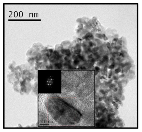 Nanoparticulated aggregate containing Si-Al-K-O-amorphous phases associated with anatase and Ti-NPs, with an FFT-containing magnification for an isolated anatase particle.