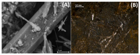 Hydrated phases formed with greater abundance during rainy and/or higher humidity periods. (A) Analysis of pickeringite by FE-SEM; (B) Photo of gypsum using magnifying glasses attached to a Nikon digital camera.