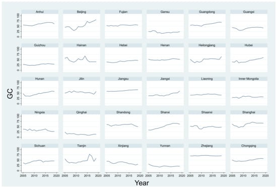 In practice, the People’s Bank of China has established a special statistical system for green loans to standardise the statistical calibre. Still, the statistical data are only at the national level, and there are only seven annual data from 2013 to 2019, with small sample size. In the existing studies, most studies use the ratio of interest expenditure of six high energy-consuming industries5 to the total interest expenditure of industrial industries to measure the green credit situation of each province [51,52]. The data are mainly derived from China Industry Statistical Yearbook and China Economic Census Yearbook. Provincial panel data better expand the sample size of data and reflect provinces’ heterogeneity. Therefore, this paper also refers to this practice. Since the Eleventh Five Year Plan, China has paid more attention to energy conservation and emission reduction and has strengthened the coordination and cooperation between environmental protection and credit management. Therefore, this paper calculates 450 green credit index values in 30 provinces and province-level municipalities (Tibet, Hong Kong, Macao and Taiwan are not included due to lack of data) from 2005 to 2019. The development trend of green credit in each province is shown in Figure 2.