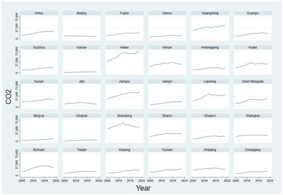 , and represent the amount of crude steel produced in the corresponding stage, and is the corresponding carbon dioxide emission factor. The emissions from energy activities and industrial production are aggregated to obtain the carbon dioxide emissions of each province from 2005 to 2019 (Figure 3).