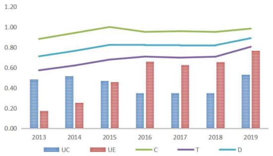 Since 2013, the People’s Bank of China has stipulated the statistical criteria of green credit and made annual disclosure. Therefore, this paper selects the annual sample data from 2013 to 2019 for calculation. The comprehensive evaluation index, coupling degree and coupling coordination degree of the credit environmental systems are shown in Table 3 and Figure 4.